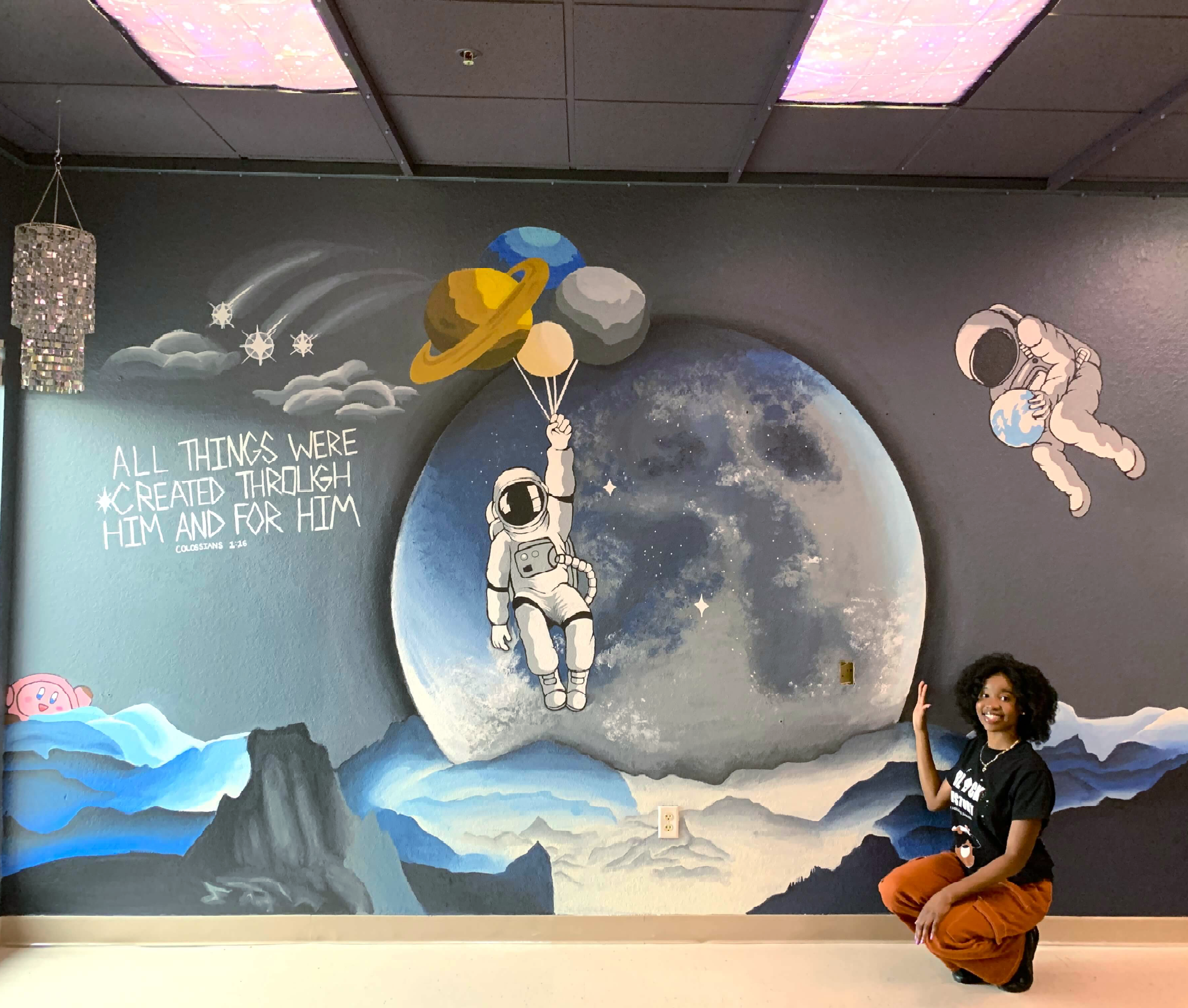I traveled to Southeastern University to paint a mural in an amazing teacher’s classroom! I was given full creative freedom using few words— space and an eager student’s request for a gaming character named Kirby. Now, his classroom screams “I am a science teacher and I LOVE what I do!”