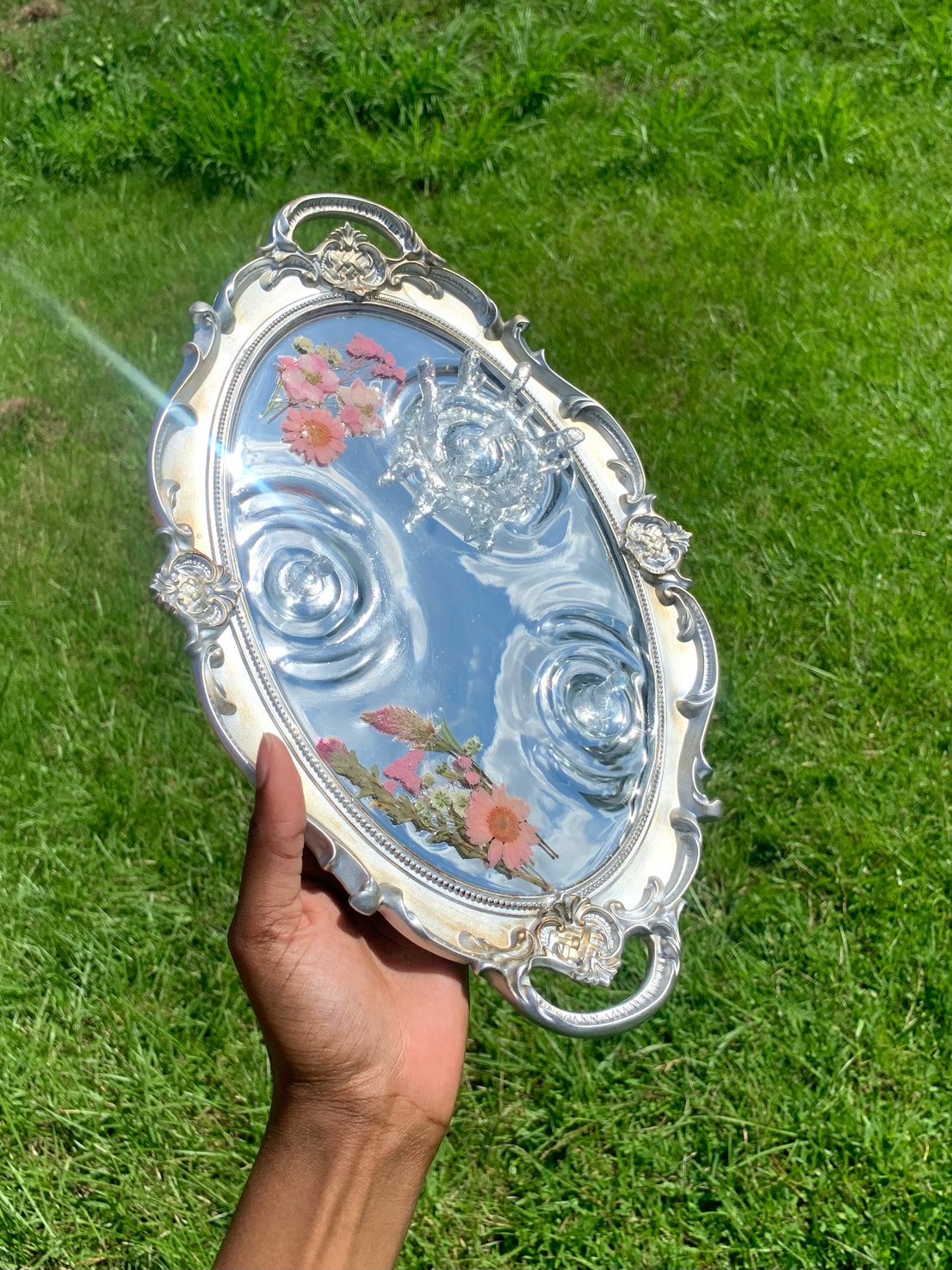 Pink Pressed Flowers Silver Round Resin Mirror & Treasure Tray