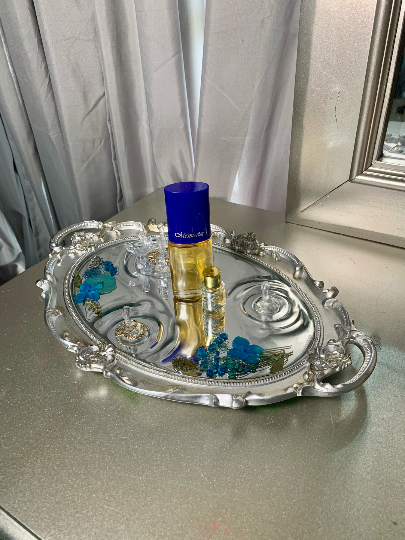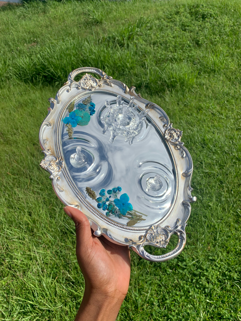 Blue Pressed Flowers Silver Round Resin Mirror & Treasure Tray